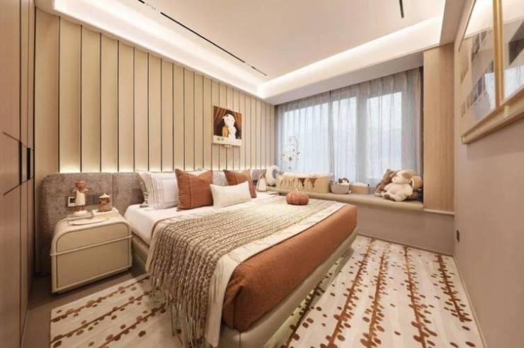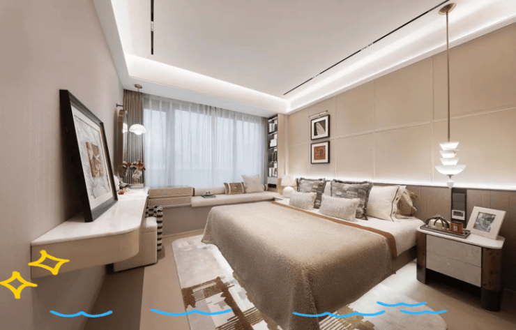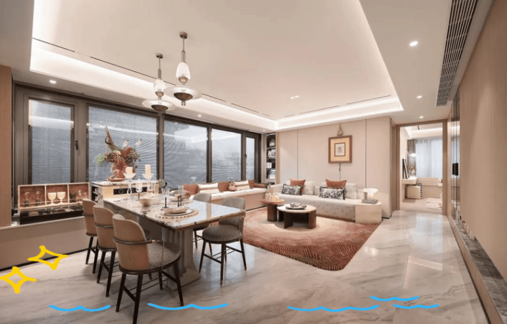 在精装修标准上,项目也是满格配置,比如中央空调,客厅岩板背景墙、墙面高档墙布;厨房老板三件套(燃气灶、油烟机、洗碗机)、可移动插座、多功能大尺寸水槽;卫生间方面,双智能马桶、暖风机、双面镜柜……