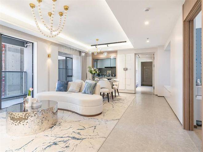 该户型南北通透,采用LDKG一体化设计理念,巧妙地将客厅、餐厅、厨房及阳台四大公共区域融合为一个超40㎡的开阔空间,强化了社交属性。
