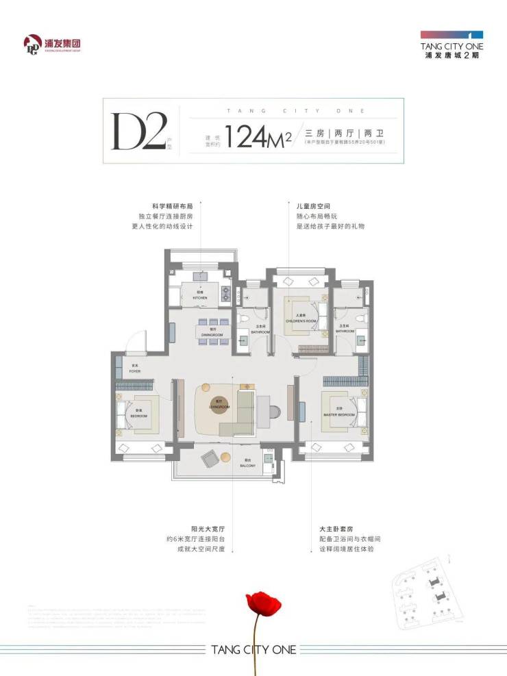 我们先来看一下即使是市区豪宅都难以做到的建面约124㎡大面宽的3房房型。