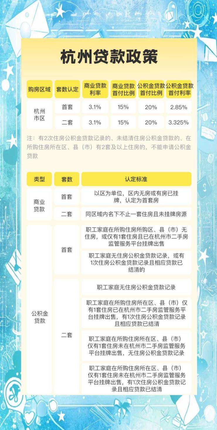 杭州近期调整了商业贷款和公积金贷款的首付及利率政策。其中,商业贷款购买首套房的首付仅需1.5成,同时享受2.85%的房贷利率;而购买第二套房时同样为1.5成的首付,利率则为3.33%。对于公积金贷款,购买首套房的首付要求为2成,利率同样为2.85%;若购买第二套房,虽然首付仍为2成,但利率上升至3.33%。