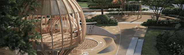 在这里,风雨连廊连接了整个小区,业主们雨天也能足不沾水回到家中;森林奇趣与海洋奇趣两大主题儿童乐园,为儿童搭建起了游玩天地;有着全龄康体设备的全龄轻氧活力场,让业主们拥有了冥想、休闲、阅读空间。