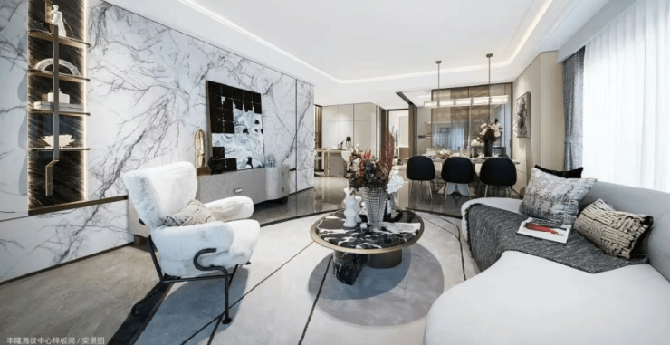 再比如,通过圆弧造型与跌级设计,让吊顶呈现出更强的立体感与层次感;而电视背景墙采用的是仿大理石岩板、搭配横向金属线条设计,这种操作能让室内更具有空间感。