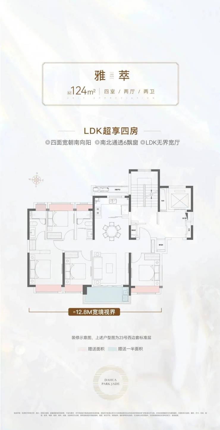建面约124㎡的4房2卫户型,通常来说是紧凑型的户型。