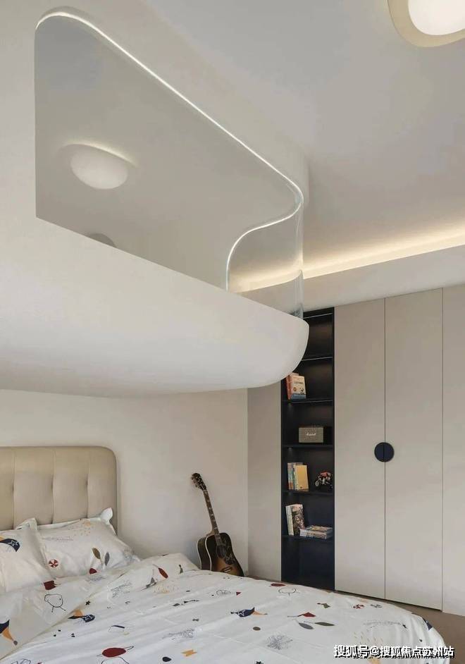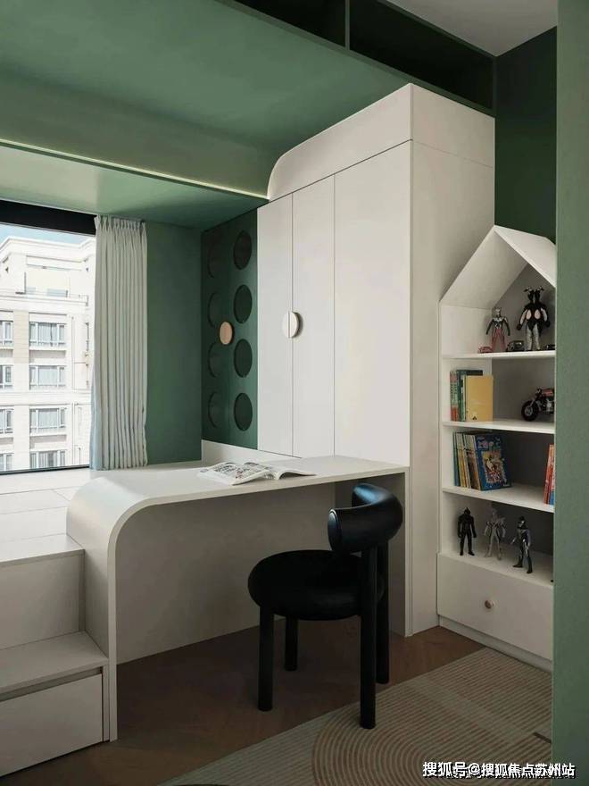 美观与功能想要兼得,可使收纳处变得更加隐形,空间一宽,心也宽了.秩序感在撞色壁柜将区域的划分中,逐渐清晰.工作台与床体的“头碰头”,也让突然的灵感有了安放之地.