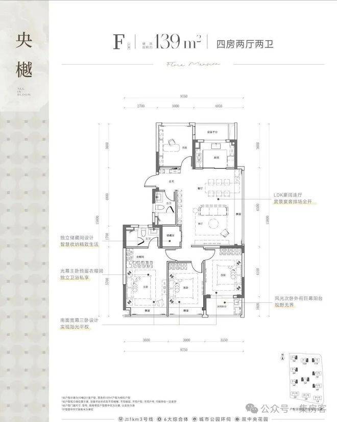 建面约139㎡的四房两厅两卫户型,则以它的南向三卧室:双飘窗+封闭阳台设计脱颖而出。整体南北通透设计,加上主卧衣帽间的贴心设置,为家庭生活提供了更多的空间选择和功能性需求。