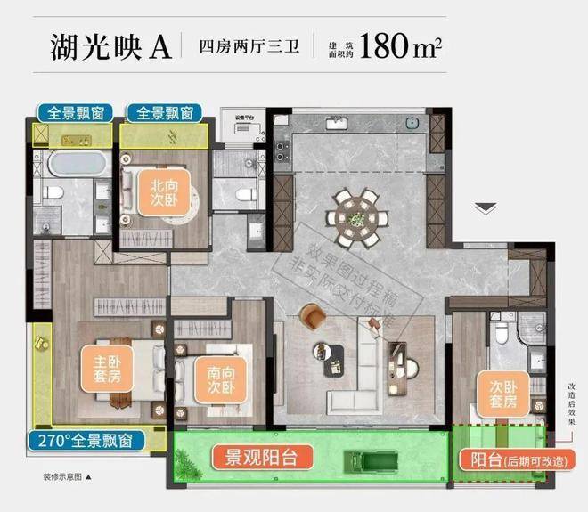 东边户整体布局呈L型,主卧、北次卧均设计全景飘窗,餐客厅由东侧飘窗+南向观景阳台形成270°广角视野,放眼望去,满目皆是沙洲湖湖景。