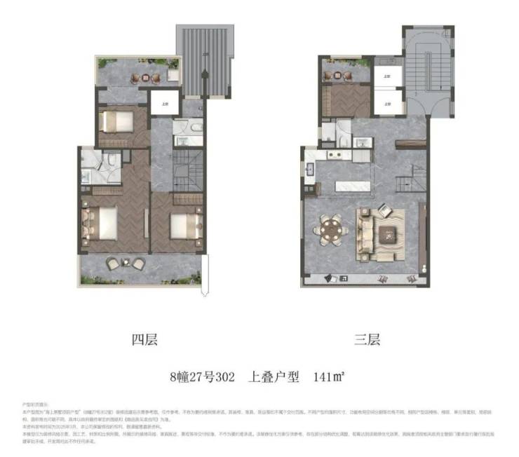 建面约141㎡上叠,餐客横厅设计,会朋宴客尽显风范;上层空间连通露台,可以瑜伽健身、莳花弄草,丰盈生活的厚度;多重卧室设计,功能性更强、更实用。