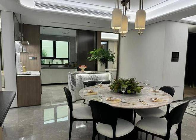 海派工艺细节:地面采用“海派大理石拼花”,灵感源自衡复老洋房的拼花地砖,墙面是“编织纹皮革硬包”,触感细腻且更耐脏,吊顶设计“天圆地方”呼应海派建筑的对称美学,室内门采用高度超2.8米的“通顶隐藏门”,视觉更舒展。