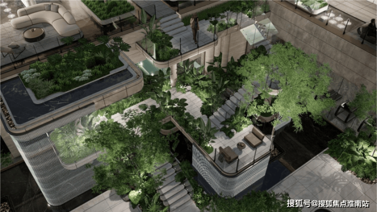 更让人惊喜的是,招商序将下沉式庭院与下沉式会所通过设计手法做了无界交融,招商序对于下沉式庭院进行了4层转角露台式的打造,通过跌水、露台与绿植的美妙点缀,使每一层都有独特的景观体验,而在下沉式会所中,可以一边健身、游泳一边享受窗外美景,非常惬意。