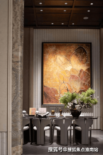 王府规制的通高大门,镶嵌昂贵天然水墨玉,自然天成的“山水画”,传递“玉出东方,门纳乾坤”的美好寓意;会客区域非遗艺术家画作《繁花映春》,耗时3月而成,诠释历久弥新的艺术价值。