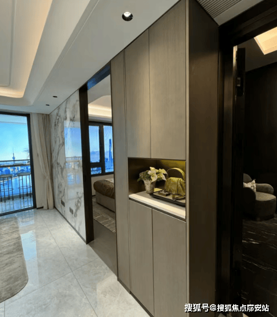 实探建面约86㎡样板间,客厅和卧室墙布交付,通顶玄关柜也是交付的。