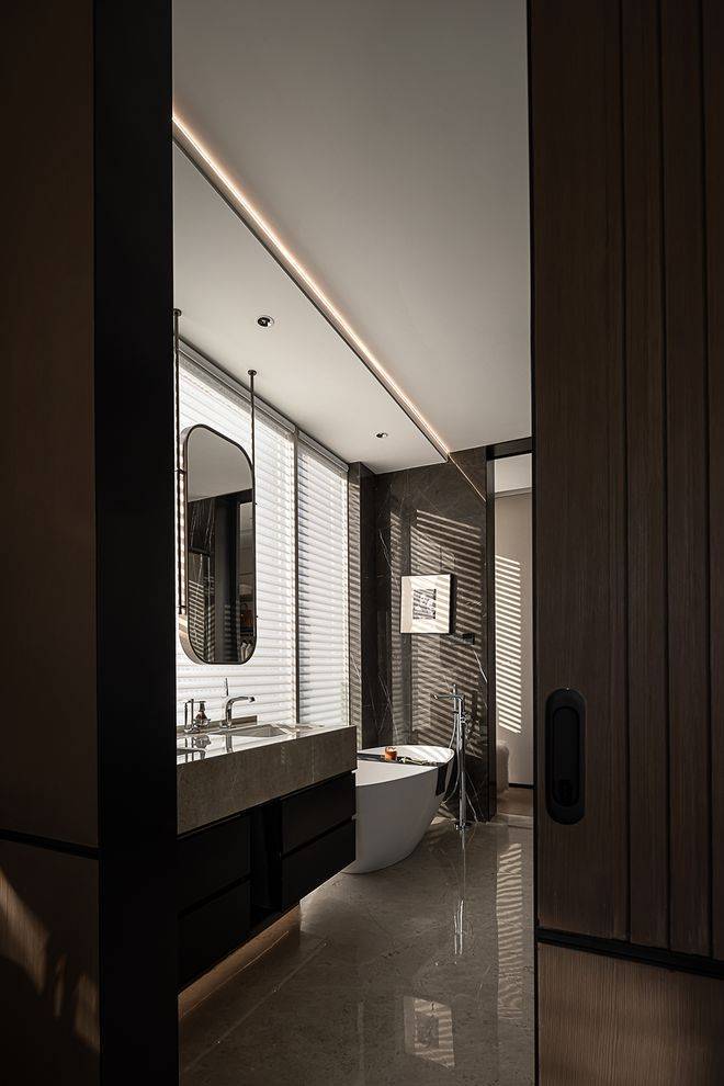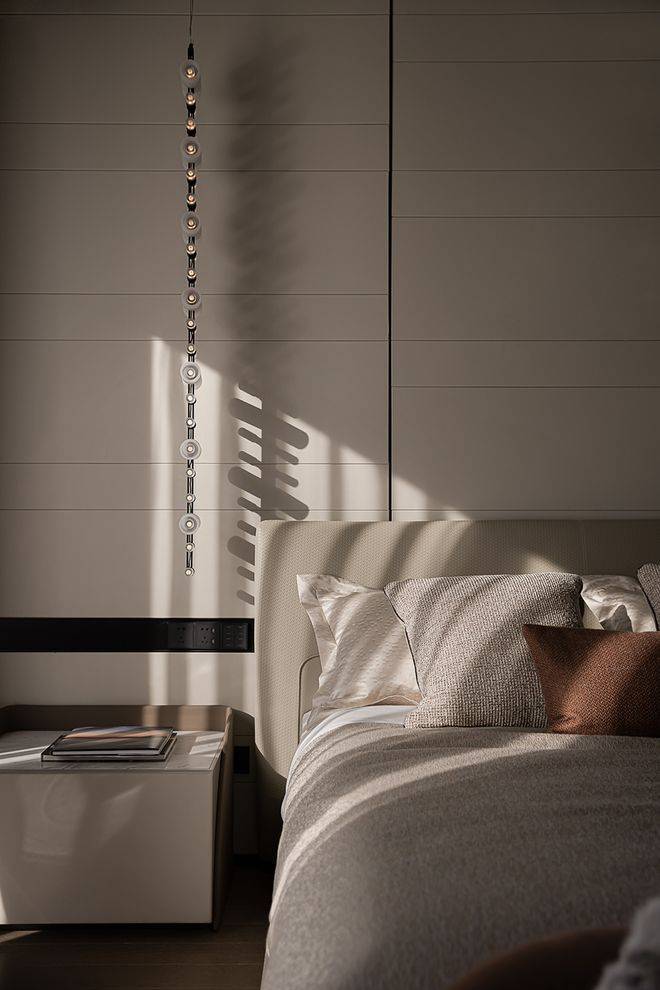 卧室是一个居所传递温度的媒介,它记录着故事,也观照着所有成长与交互。主卧内,温润木质在柔和光线的梳理下,创造出适宜休憩的环境。暖白的睡眠空间,材质间细腻无声,彼此结合,赋予沉稳静谧的调性,将一室素雅留给心无杂物的使用者。