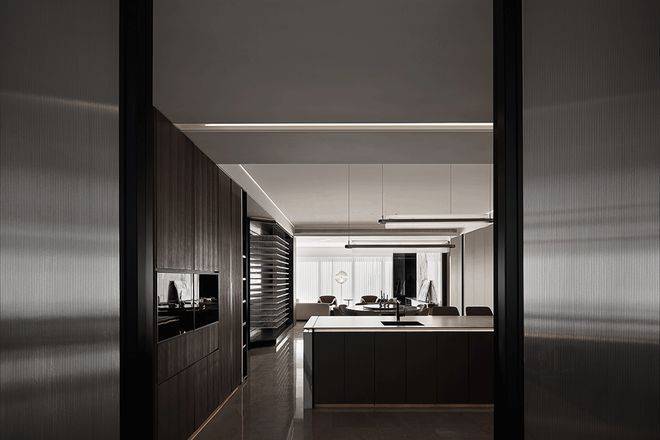 木饰墙面从客厅延展到餐厅和中岛区,利用材质软性分割不同区块。木质包含的反差感,调节空间的感官情绪,也建立起相对的静谧和独立。中岛台成为厨房与外部公共区域的纽带,消除了区域阻隔,提供更为优越的居住体验。