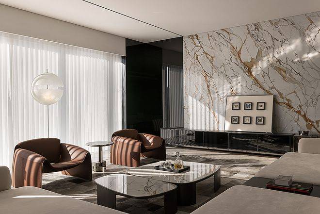 空间在材质搭配上,也是极尽雅奢可能。鱼肚白岩板打造的大岛台,营造温情的社交一隅;木饰面与金属软硬质感的碰撞,有序的墙面分割把握了整体空间的节奏感;双背景墙分别由鱼肚金岩板和劳伦黑金色系展墙组成彰显奢华。