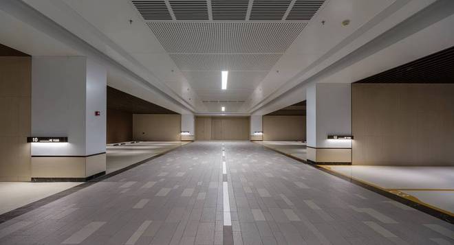 当然,更炫技的还是它的车库。传统地下车库,顶多隔3个车位就有支撑柱,但理想荷院两根支撑柱间的距离,最长能到13.8米,千万级房车Elemmengt Palazzo都能停得下。再加上约3.2米的净高和大片铝格栅吊顶,真是气场强大。抬头细看,地库顶部的喷淋、烟感与铝扣板拼缝还全部横竖对线。不得不感叹,这真是一家“处女座”房企。0