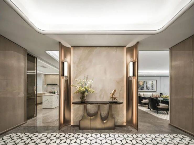玉兰门庭—迎归大堂—莳花荟为主轴,敬献步履生辉的归家艺旅:玉兰门庭如繁花盛绽,尊华瑞鳞水景聚运生财,双尊铜狮镇守家宅;迎归大堂流转光影艺韵,百羽栖澜艺术雕塑、芦海宸韵非遗绣作流淌摩登气韵;莳花荟中央会客厅移步异景,献映会客、休闲等雅会。