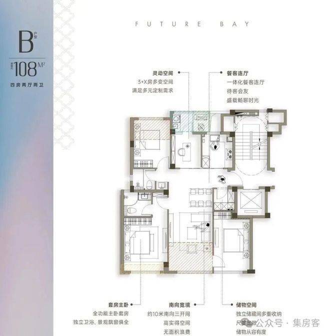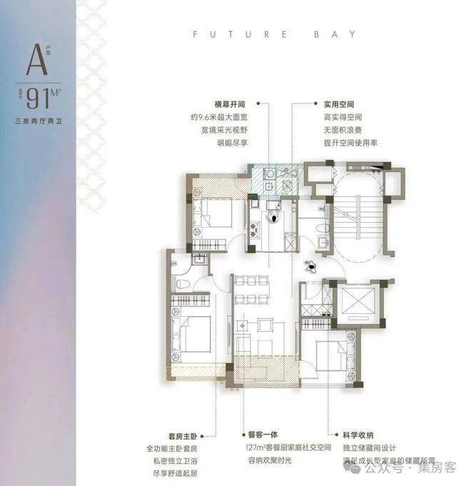 餐客厅开间6米,面积达到约60方,媲美200方大平层居住体验,主卧采用270度飘窗设计,可更好的提升主卧采光及景观。