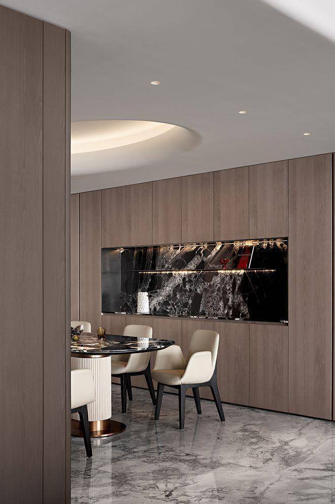 餐厅区域的设计独具匠心。设计师巧妙利用转角空间,通过木质餐椅与大理石地面的材质对话,营造出温馨的用餐氛围。区域尺度经过精确计算,既保证了使用的舒适性,又维持了整体的开放感。