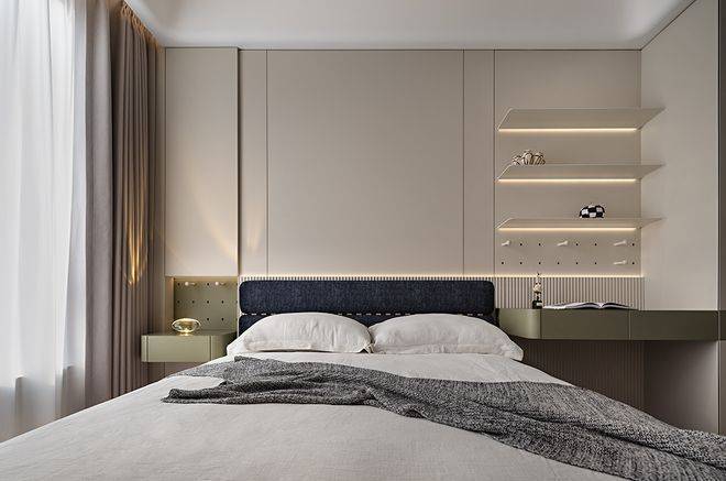 主卧延续了整体的设计语言。墨绿色悬浮床头的设计既满足收纳需求,又成为空间的视觉焦点。对称的布局营造出安定的休憩氛围,而悬空的置物板则展现了现代设计对实用美学的追求。