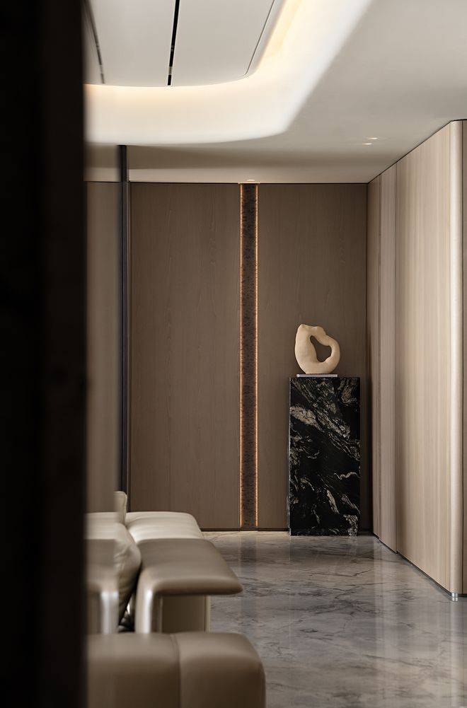空间中的艺术细节值得玩味。墙面精心设计的线性凹槽,角落陈列的雕塑作品,这些看似随性的点缀实则经过严密推敲。它们以微妙的介入方式,为简约的空间注入了生动的韵律。