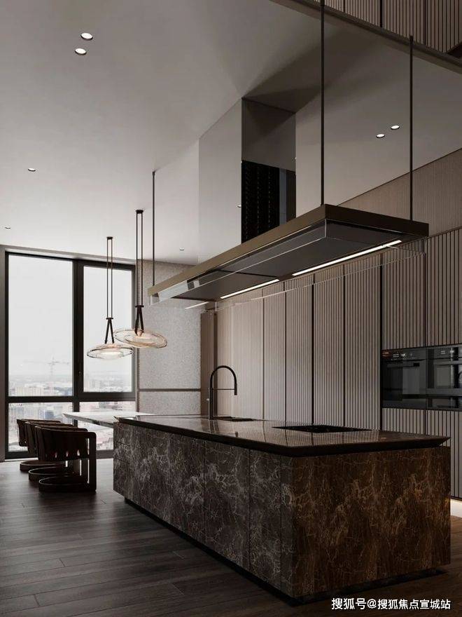 上海浦东绿宝园·翡梵售楼处电话:400-8558-224绿宝园·翡梵官方电话:400-8558-224整个餐厅的墙壁和天花板全部使用可视镜作为装饰,把客厅和餐厅的风景全部融合在一起,餐厅的餐桌和大理石岛台完全烘托出现代的氛围感。