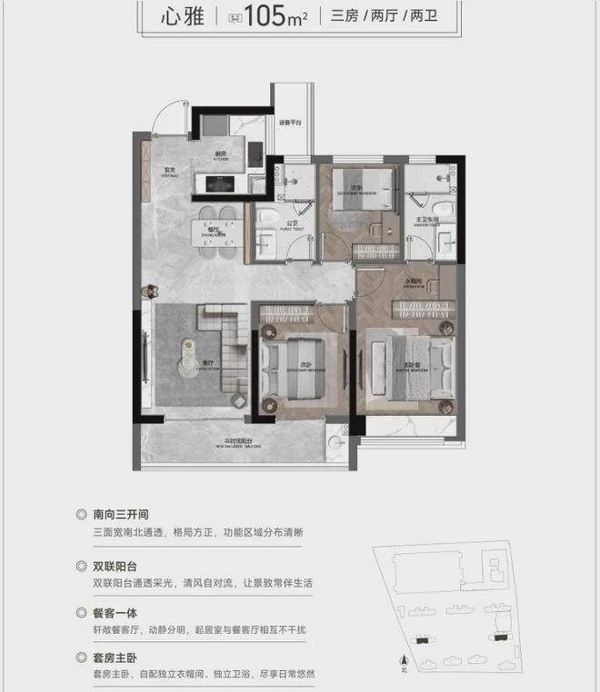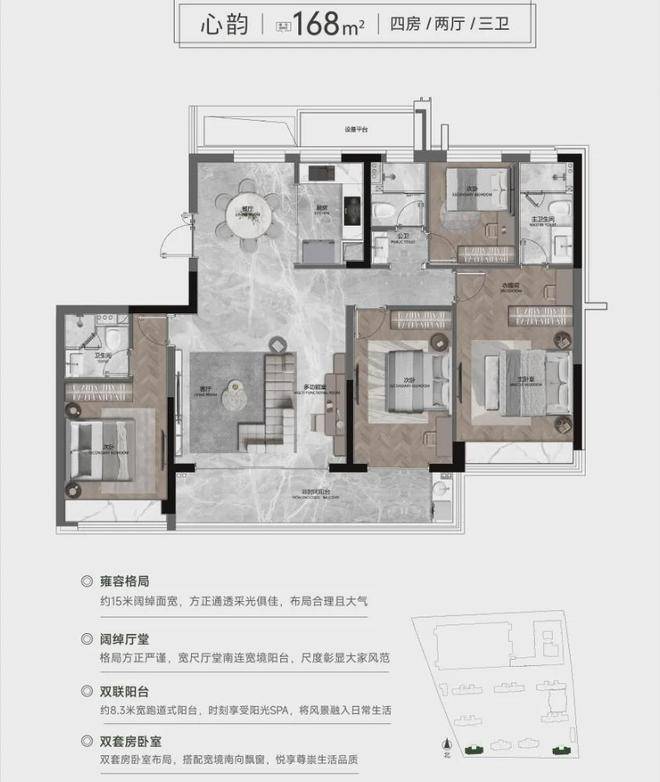 春山禾府是国晟发展携手山姆、绿城管理打造的战略重要作品,占位双溪湖超级未来社区核心、山姆之上,构筑嘉兴首个山姆生活综合体,总建筑面积约21.7万㎡,容积率约为2.2。拥有双河景观,南倚水岸公园,项目内规划3万方+春山里都会森林,运用大面积高级灰玻璃幕墙,搭配定制级铝板与洗练线条,打造水滴建筑立面,规划建筑面积约105-188㎡全维户型空间。