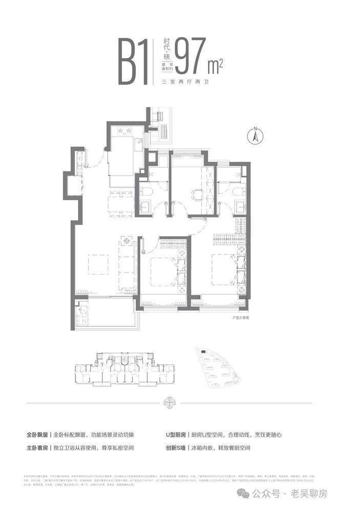 建面约97m²三房两厅两卫户型,全卧+主卫飘窗配置,并通过飞机户型空间布局,提升了空间的使用效率,让温情在自然中自然发生。