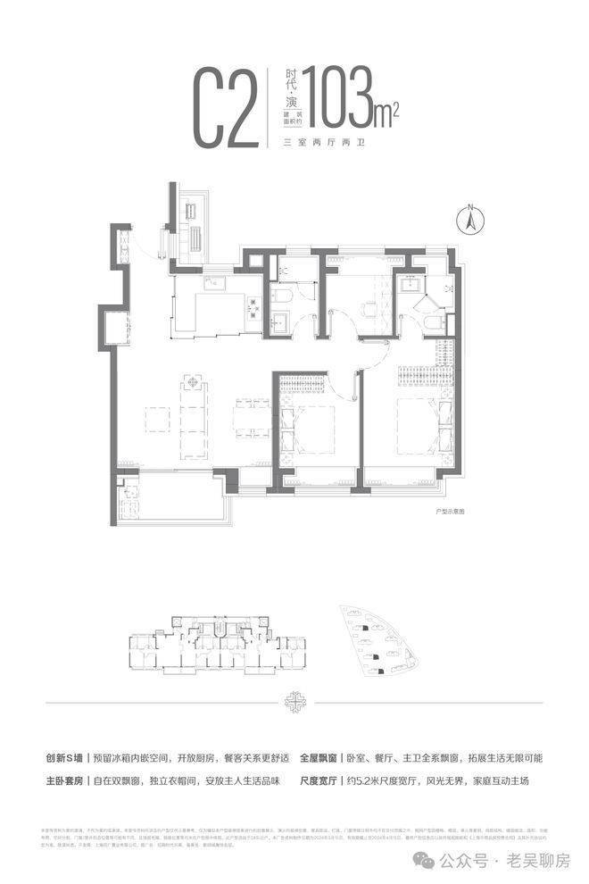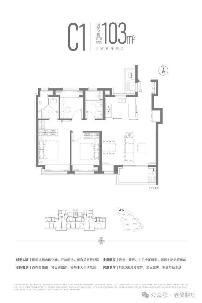 建面约103m²三房两厅两卫户型,南北双卧L型270°揽境飘窗设计,更大限度地让自然融入与自在之中,更宽阔的空间尺度,让自在生长与自然之中。