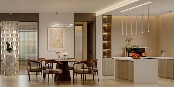 建筑风格:项目采用现代中式建筑风格,将传统韵味与现代简约线条完美融合,营造出一种低调内敛的豪宅气质。