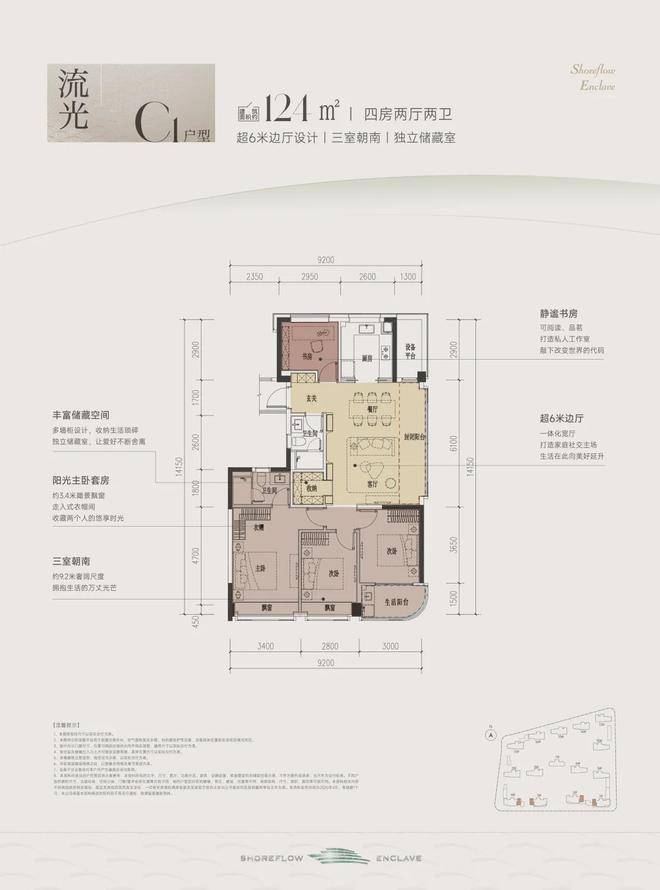 这款户型堪称四开间朝南的“流量王者”,南向面宽约13米,双联阳台+双飘窗设计,视野和采光优秀;套房主卧、双阳光次卧,颇有大平层的气势。