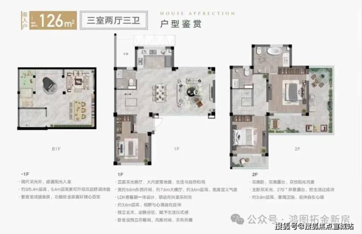 3.功能布局 一层设超宽横厅(9.2米面宽)、南向老人房;二层为主卧套房+次卧;地下层高3-5.4米,可改造为影音室、酒窖等功能区。