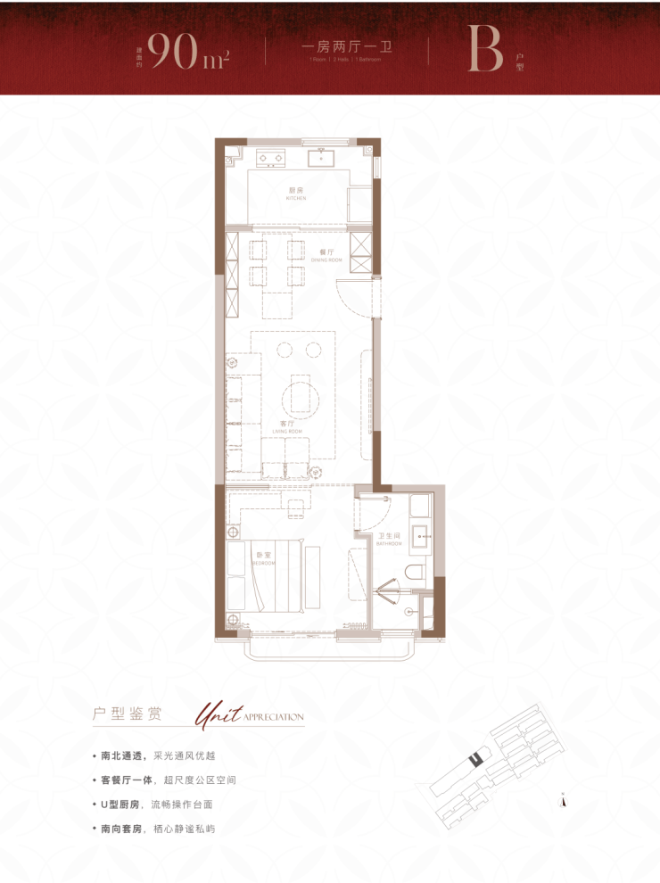 建面约90m²尊享1房户型,在100m²的基础上,进一步降低总价门槛的同时,也带来了设计上针对实用性的小巧思。