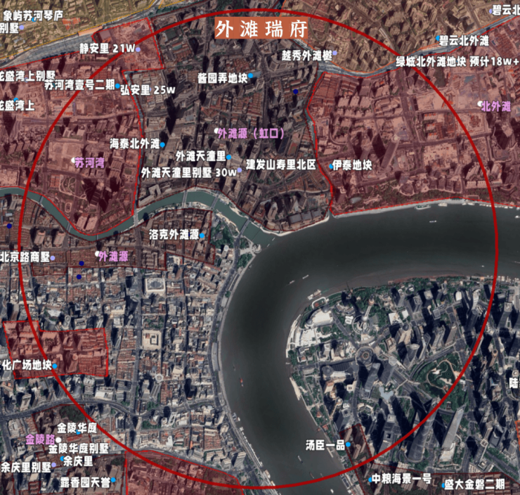 翻开1916年上海地图,以黄浦江与苏州河“一江一河”交汇处为原点,外滩瑞府所在地块,恰处于城市核心第二圈层(1-2公里范围内),与华侨城苏河湾并列,而金陵华庭则位于第三圈层。