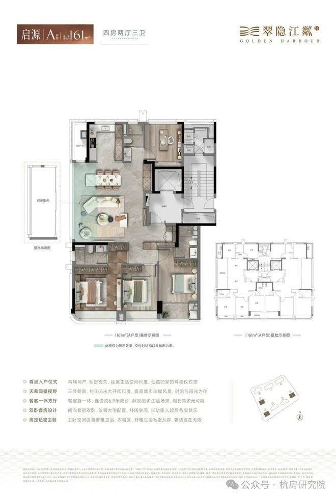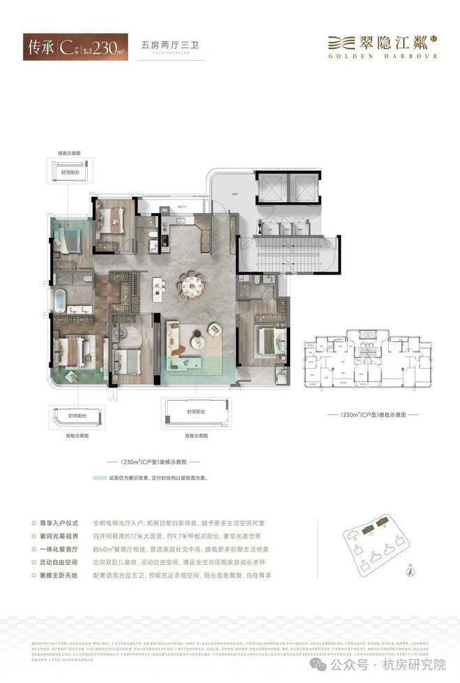 在杭州目前新房市场中,使用率能真正做到约90%的楼盘,凤毛麟角。翠隐江粼轩通过封闭阳台只算半面积+电梯厅空间转化(公区),实现使用率最大化。建筑面积约230㎡户型更是做到了近66㎡客餐厅+双套房布局,空间感媲美很多二手老豪宅的260㎡。