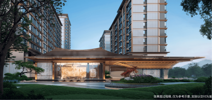 项目创新打造了杭州首座“诗意东方”产品,约50X10米的威仪门庭。融合中式传统建筑中的庑殿金顶、建筑斗拱和山水映画。