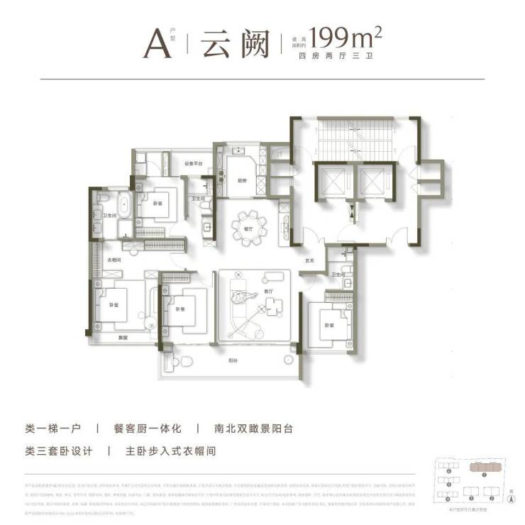 高层建面约199方,有A、B两款,四房两厅三卫双套房格局,南北通透、类独门独户、南向奢阔瞰景阳台,每一个都相当有“杀伤力”。