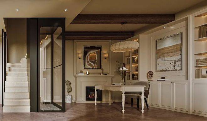 将客厅分为接待区与阅读区,可与三五好友畅谈人生,可与儿孙共享天伦之乐!阅读区配以乳白色书桌、书柜及壁炉,清爽又不失法式的温柔。