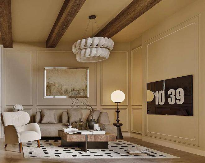墙面搭配精致的PU线条,彰显出法式复古风的精致与优雅!胡桃木鱼骨纹拼接地板搭配顶部原木的横梁,与复古吊灯相呼应,体现出法式的沉静与典雅!