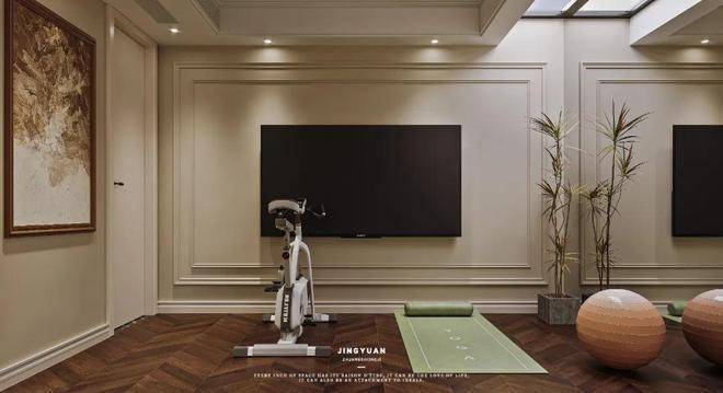 本图的正前方墙上安装了一台电视,左侧为一整面墙的玻璃,业主可以跟着视频一起锻炼,运动效果拉满!
