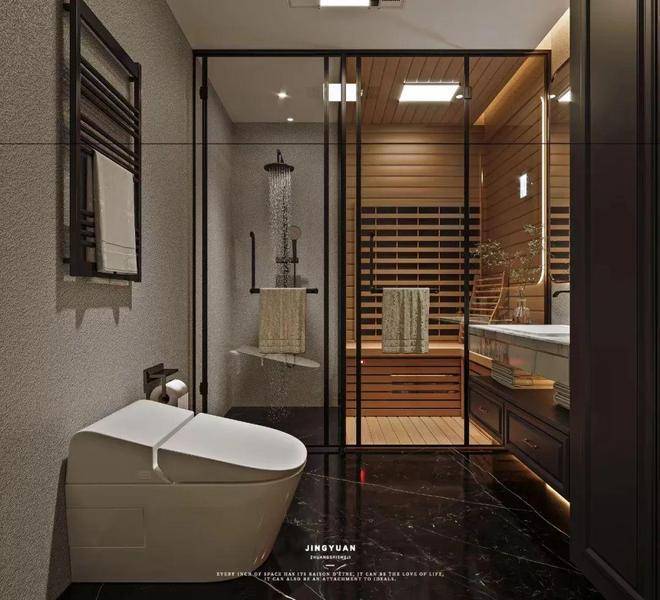 公卫:整体墙面刷以浅灰色硅藻泥,地面与侧边柜统一为黑色,简单大气又不失法式复古的高级。左侧为淋浴房,右侧为汗蒸房;运动完之后、闲暇之余可做做汗蒸,排除身体湿气!