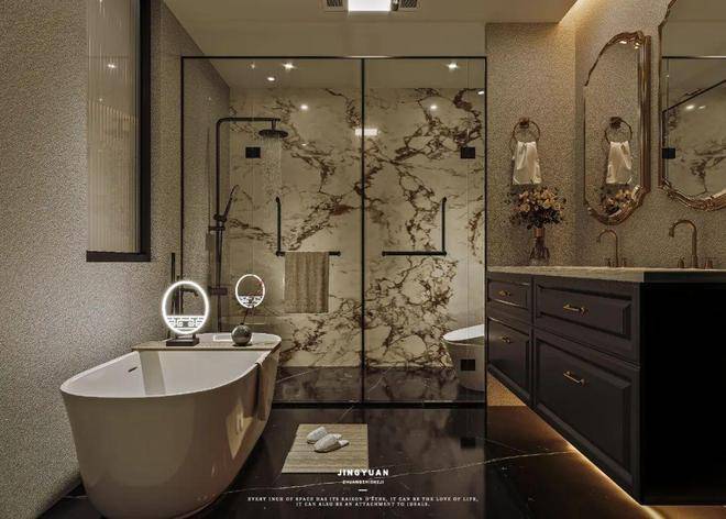 主卫:干湿分离的布局设计,既便于生活的使用感,又满足了业主泡澡的浪漫,更提升了卫生间的美感!