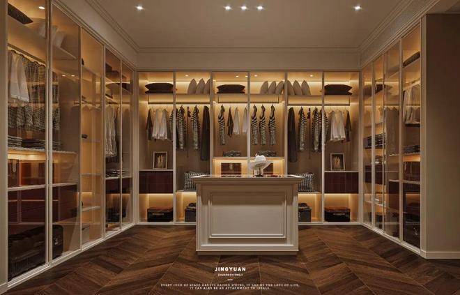 衣帽间柜子全部安装玻璃门,内部收纳清晰可见,避免找不到的烦恼~也更利于清洁打扫。再多的衣服也不怕没地放了!中间岛台可放置女主人的各类首饰包包。胡桃木与玻璃门的搭配,是现代与古典的结合!这超大的衣帽间,谁不爱呢?