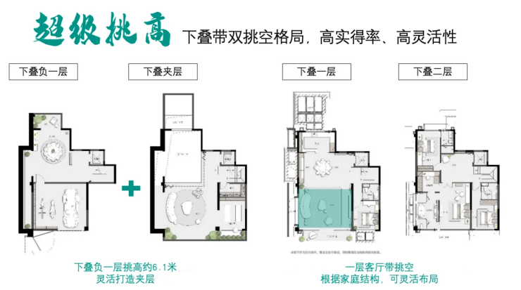 区域内首创地下室6.1米挑高:地下夹层自此不再压抑,同步4个采光井设计,无需为采光通风问题担忧,让地下室真正成为生活功能空间。