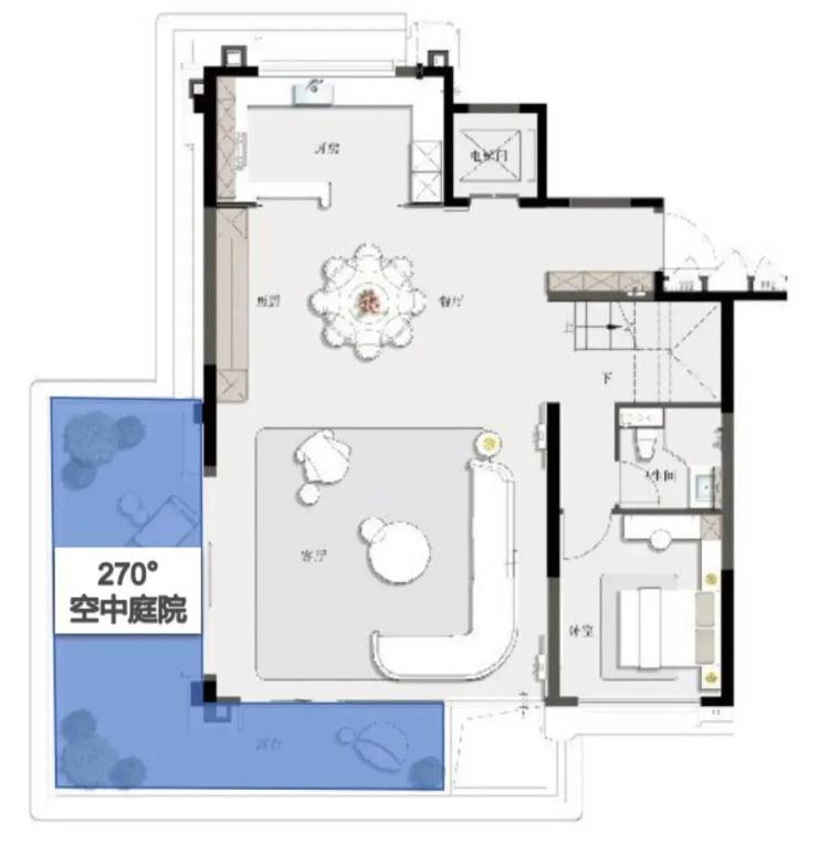 该户型打破 “中叠无庭院” 的固有认知,在首层就配置了270° 空中庭院。