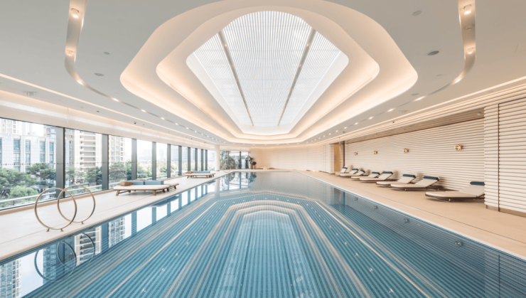 约3000㎡国际会馆内,规划了室内恒温泳池、健身房、董事会议室、会所沙龙、五星级大厨定制家宴包间、儿童活动室等空间。作为国内罕见的空中江景生活场域,配置270度MAX VIEW落地水晶玻璃,瞰城市夜景、浩荡江景,直面世界风光。