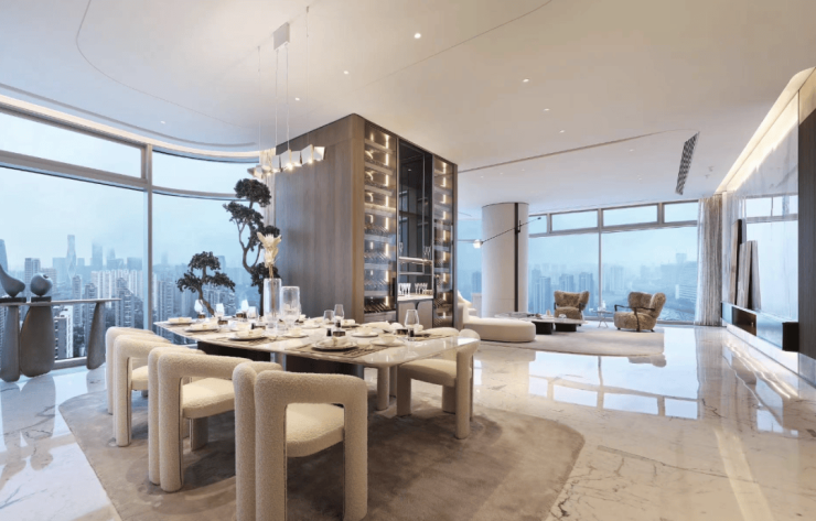 F+P的顶级豪宅设计经验与顶级酒店设计王者HBA的奢华体验,碰撞出全新灵感,尽呈登峰造极的顶豪E户型样板间。眼前尽是壮阔景象,客、餐、厨一体设计,呈现比排球场还大的无界奢厅,大气卓越。它以大岛台为枢纽,营造硅谷精英式的社交生活,也尽可满足名流酒会、家族宴会,亦或是董事会议的临时场所。