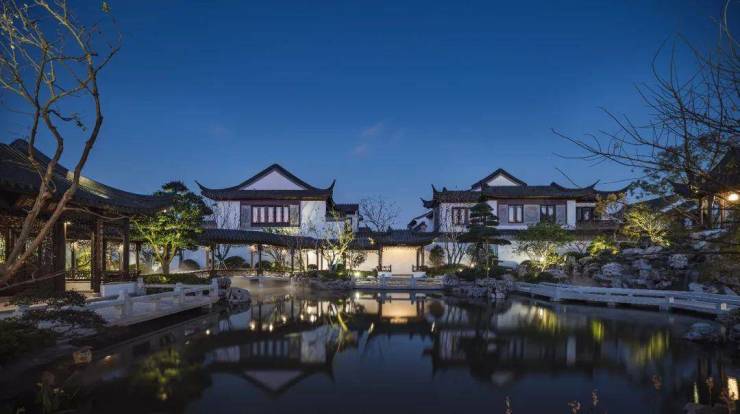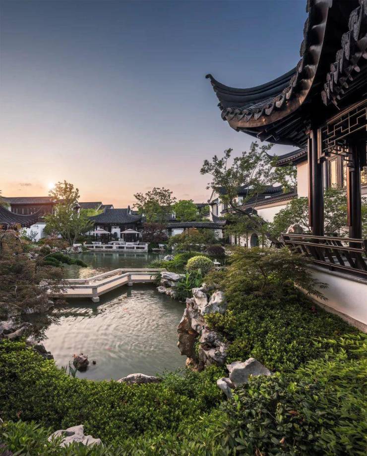 项目盛邀非遗“香山帮”的大师国匠参与建筑施工,采用宋明风格,甄选世界名木,融入斗拱、镂空雕花等诸多传统建筑元素,建筑细节精美绝伦。
