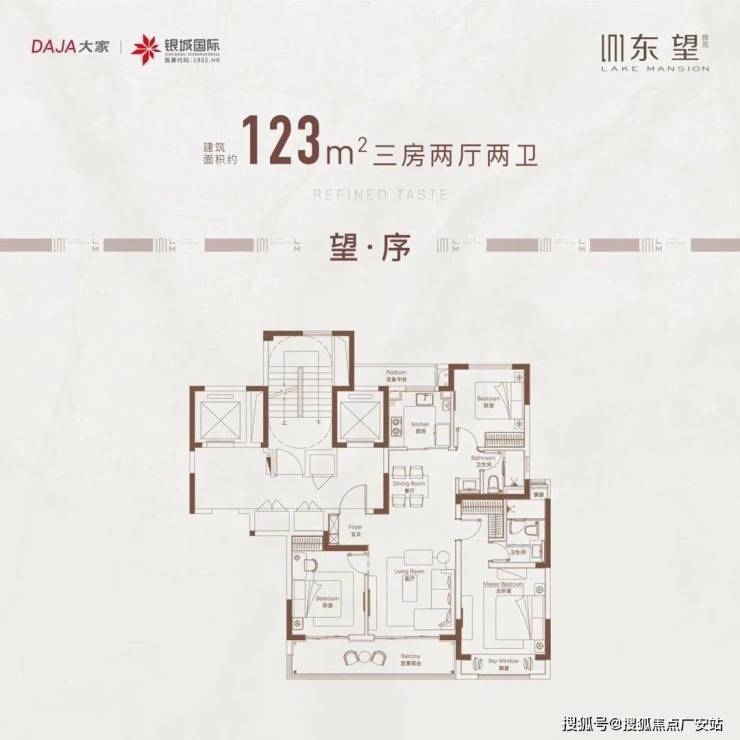建面约123㎡:户型,三开间朝南,约6.9米双面宽景阳台,主卧套房设计,匹配独立卫浴。