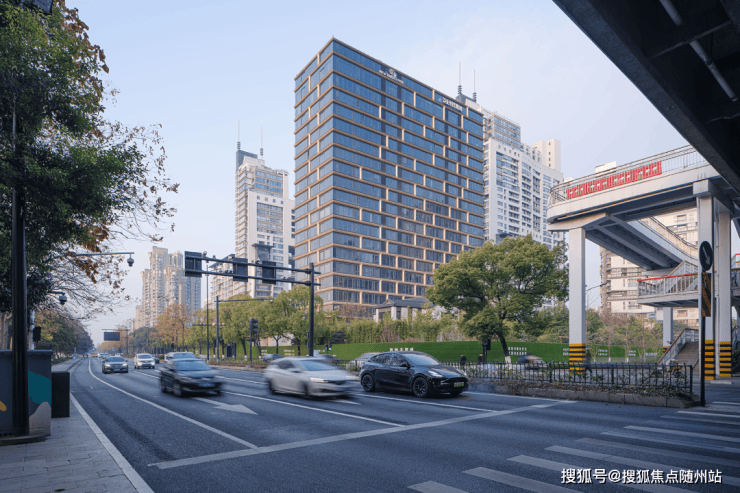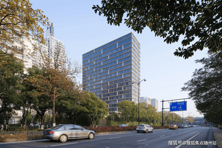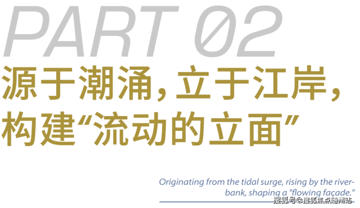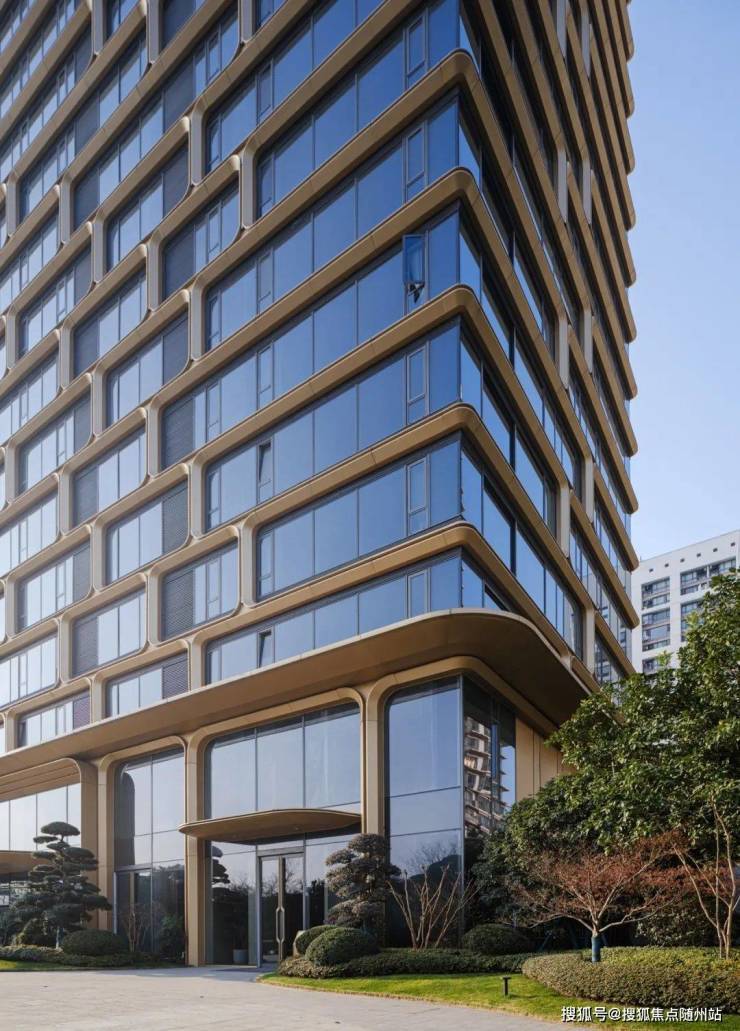 以“潮涌”为意象,立面设计提取钱塘江水的流动节奏,抽象为层层律动的香槟金色曲面铝板与大面玻璃系统交织的建筑语言。
