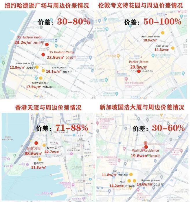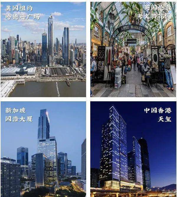 我们来看几个享誉全球的成功案例,纽约哈德逊广场,伦敦考文特花园,新加坡国浩大厦,香港天玺,这些顶级公寓都有一些共性点: